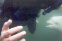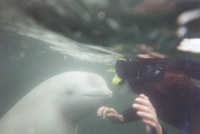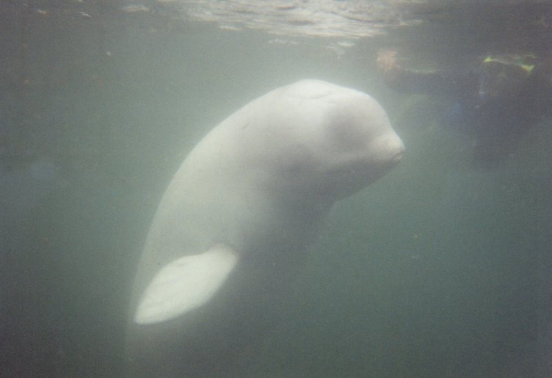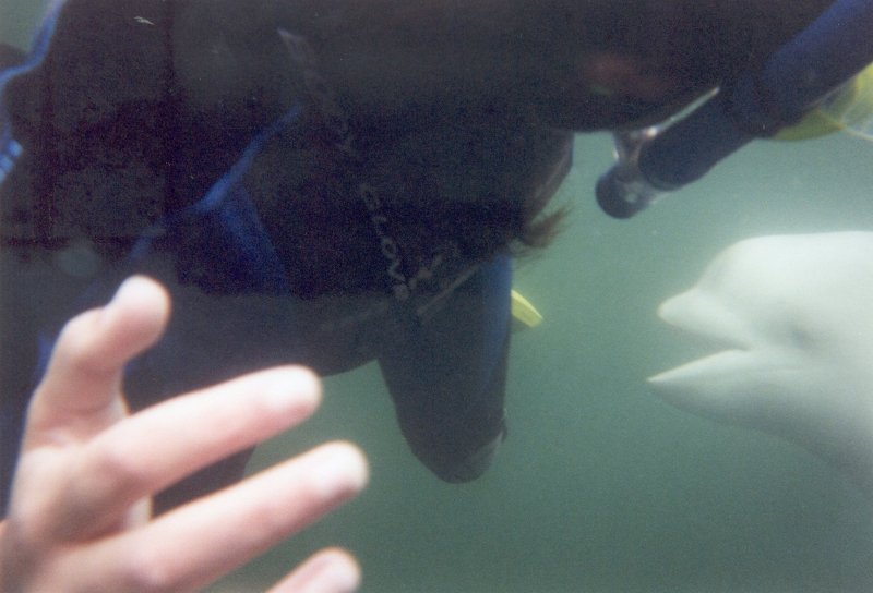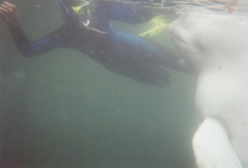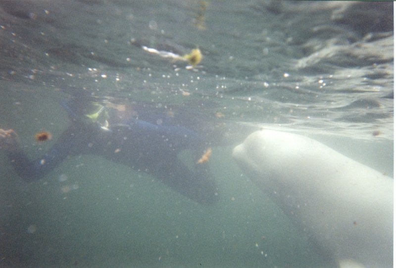 There have been other Beluga whales known to be sociable to humans but this one showed up in our world at this time. He enjoyed pushing dinghies around and even squirting giggling children with water. A belly rub from a SCUBA diver was always a treat. Many divers reported meeting up with him. One diver was accompanied for not just 1 but both dives he made that day. While we all knew he was a whale in the wild people could not avoid likening him to a dog, a circus performer or a mischievous child. Poco was 8-9 feet long and weighed an estimated 800 pounds. He was believed to be about 3 years old, adults often reach 25-30 years of age. He was light gray in color, not yet not yet the white of an adult.