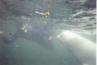 We lost sight of Poco for a few minutes only to find him getting a belly rub from SCUBA divers perhaps 15 feet below. They surfaced and the four of us savored the moment as Poco worked the crowd, checking us all out. This encounter was seen frequently on local TV stations since the divers had a camcorder running the whole time. This time we had an underwater camera and managed to get a few good souvenir photos that we are sharing on this page.