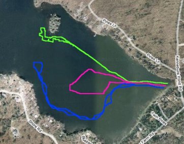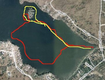 If you want something more ambitious then head up the left (south) side well past the 3 boats (Red on map) until you are across from the island and cross to the island. Explore in the rocks or circle the island before working your way back down the south side to the beach. My wife and I have a goal to circumnavigate the pond on a skin-dive someday.