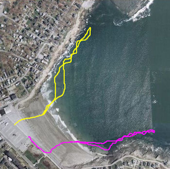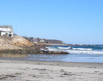 This is a low tide view. It shows the rocky ledges that run down the the sandy bottom. This was shot on a breezy spring day. The waters here are often calm.