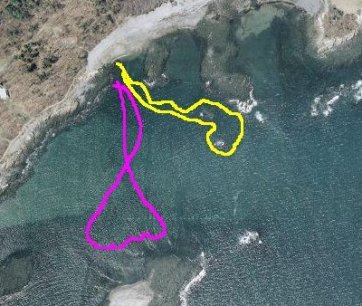 The yellow dive is the more interesting rocky dive that you will want to do on your highest tide. The magenta dive out towards the ledge is pleasant and can be interesting if you loop it out to the east in the rocks on the return.